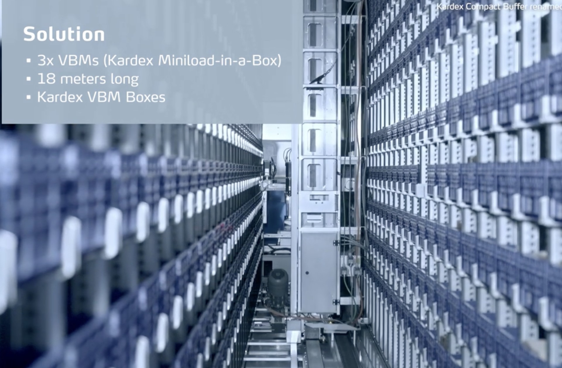 - β’Five Kardex Miniload-in-a-Box systems: two for small parts, three 18-meter extended versions for full bin picking