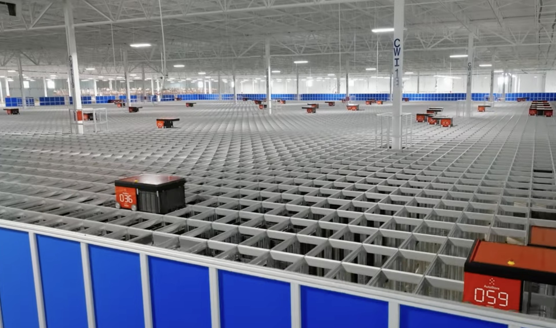 The facility features an AutoStore cubic storage system housing approximately 53,000 of the total 65,000 SKUs. The system provides high-density storage and efficient goods-to-person retrieval operations. Robots deliver bins to picking stations where operators fulfill orders using visual guidance systems.
