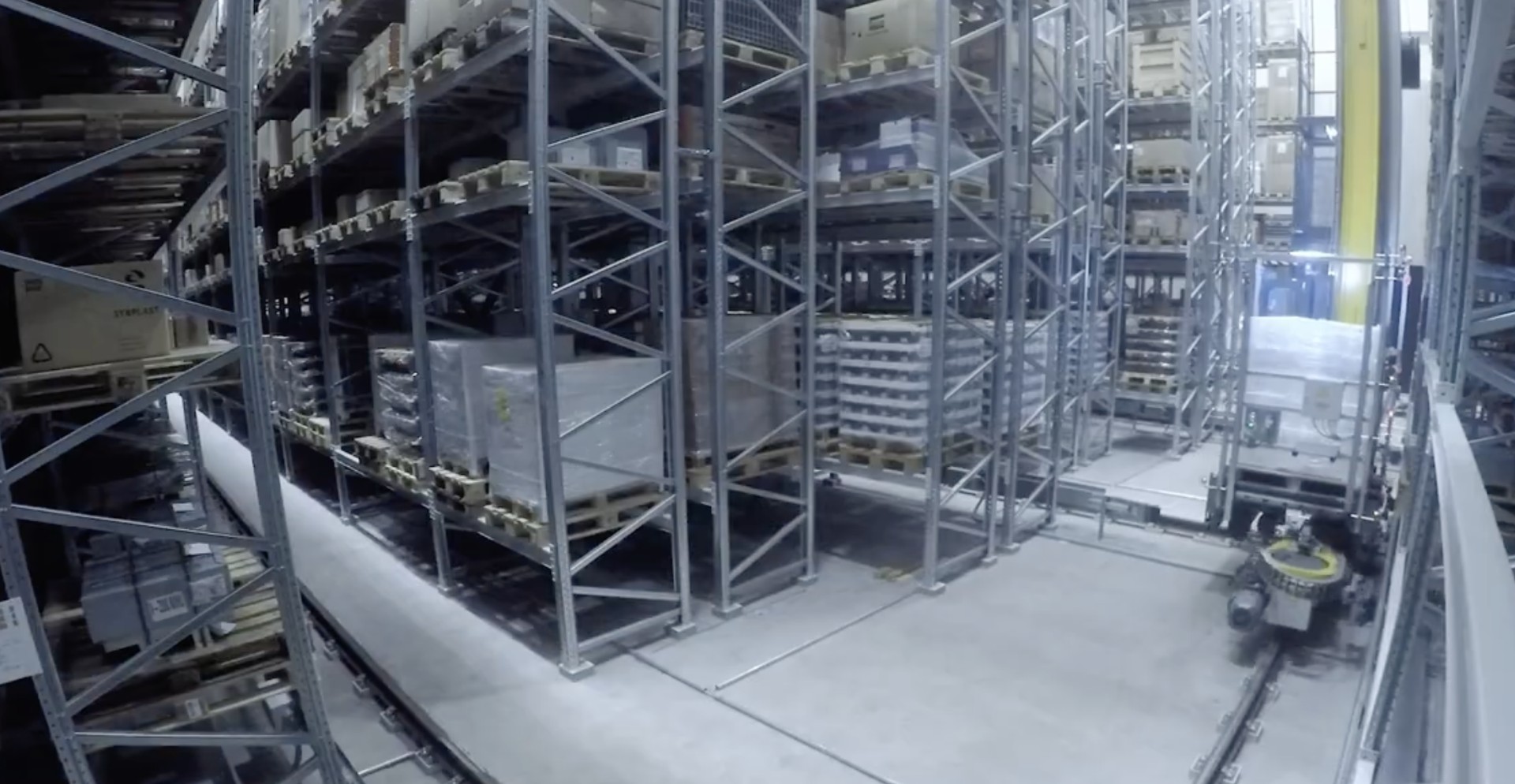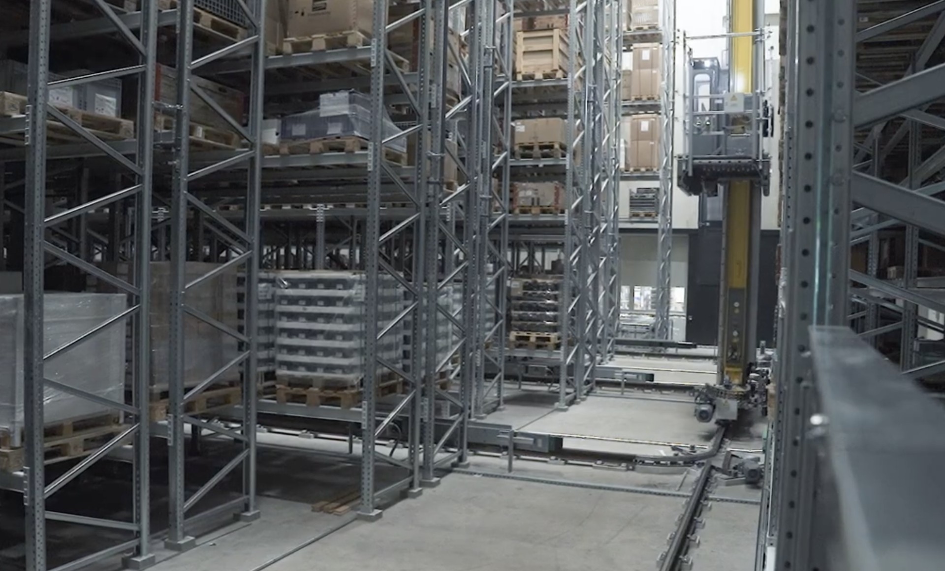 The four-aisle high-bay warehouse with autonomous SRMs that change aisles represents advanced automation compared to the previous manual operation, eliminating the need for dedicated personnel to operate storage and retrieval equipment.